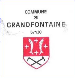 De gueules à deux saumons adossés d'argent accompagnés de quatre croisettes du même; à la champagne d'argent chargée d'un pic et d'une masse de mineur de sable passés en sautoir.