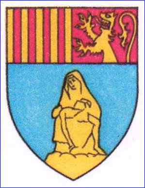 D'azur à la Piéta d'or sur un rocher du même mouvant de la pointe; au chef parti au I d'or à quatre pals de gueules et au II de gueules au lion d'or issant du trait du chef.