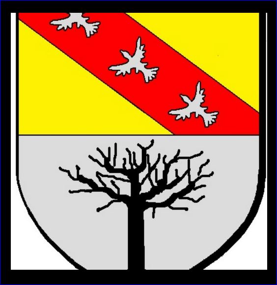 Coupé: au 1er d'or à la bande de gueules chargée de trois alérions d'argent, au 2e d'argent au noyer sec de sable.