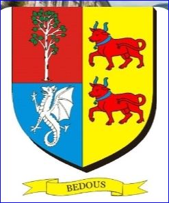 Parti: au 1er coupé au I de gueules au bouleau au naturel, au II d'azur au dragon rampant d'argent, au 2e d'or à deux vaches de gueules, accornées, colletées et clarinées d'azur passant l'une au-dessus de l'autre.
