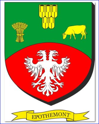 (2021) Coupé voûté: au 1er de sinople à cinq tuiles accolées 3 et 2 en chef et accompagnées en flanc d'une gerbe de blé à dextre et d'une vache paissant à senestre, le tout d'or, au 2e de gueules à l'aigle bicéphale d'argent.