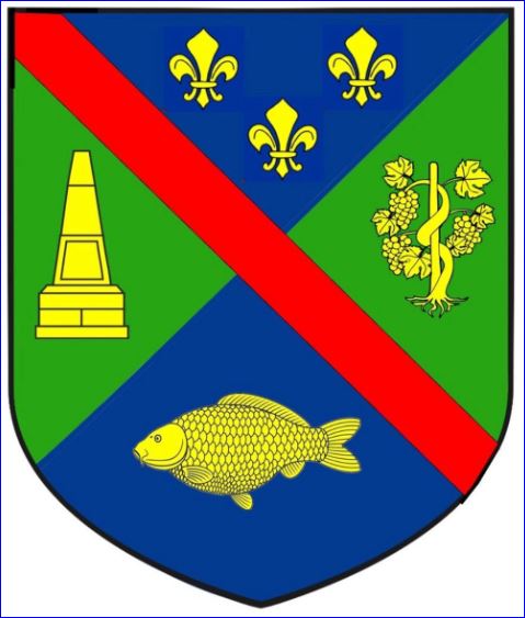 (2025) Écartelé en sautoir: au 1er d'azur à trois fleurs de lis d'or, au 2e de sinople à la pyramide de Condé du lieu d'or, au 3e de sinople au cep de vigne tuteuré d'or, au 4e d'azur à la carpe d'or; à la cotice de gueules brochant sur la pertition.