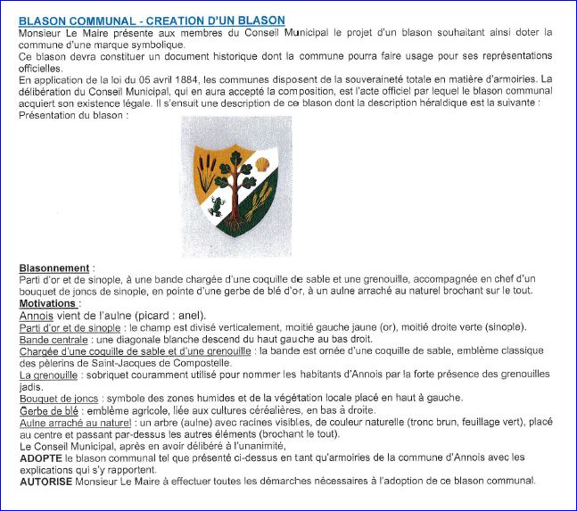 (2025) Taillé: au 1er d'or au bouquet de trois roseaux à massettes au naturel, au 2e de sinople à trois épis de blé, tigés, feuillés, empoignés et liés d'or, posés en barre; à la barre d'argent chargée en chef d'une coquille d'or, versée et posée à plomb et en pointe d'une grenouille de sinople, ladite barre brochant sur la partition; à l'aulne au naturel brochant sur la barre.