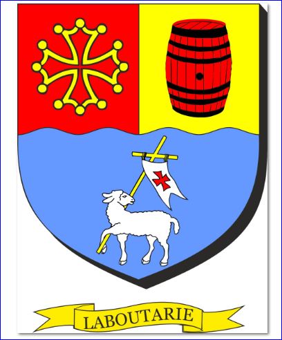 Coupé ondé: au 1er parti, au I de gueules à la croix cléchée, vidée et pommetée de douze pièces d'or, au II d'or au tonneau de gueules cerclé de sable, au 2e d'azur à l'agneau pascal d'argent, la tête contournée, tenant une croix haute d'or à la bannière d'argent chargée d'une croisette de gueules.