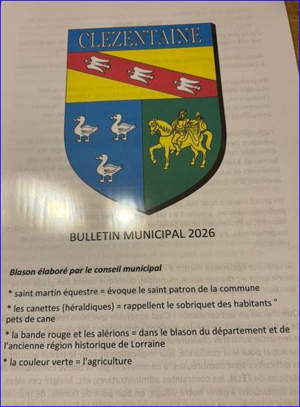 Parti: au 1er d'azur à trois cannettes d'argent, au 2e de sinople à saint Martin équestre d'or; le tout sommé d'un chef abaissé d'or à la bande de gueules chargée de trois alérions d'argent et surmonté d'azur à l'inscription « CLEZENTAINE » en lettres capitales d'or.