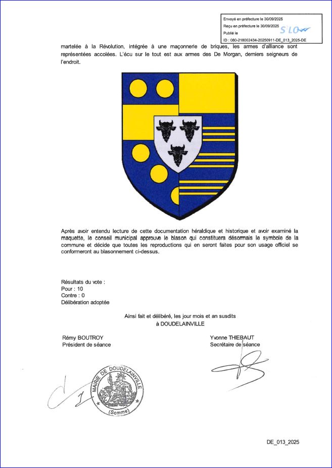 (2025) Mi-parti: au 1er d'azur à la fasce haussée d'or accompagnée de dix besants du même, quatre rangés en chef et six en pointe, 3, 2 et 1, au 2e d'azur à trois tierces d'or et au chef d'or plain; sur le tout, d'argent à trois rencontres de boeuf de sable.