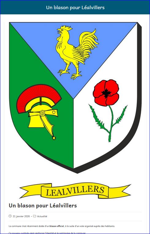 (2026) Tiercé en pairle: au 1er d'azur au coq d'or, au 2e de sinople au casque romain contourné d'or et empanaché de gueules, au 3e d'argent au coquelicot au naturel.
