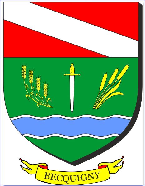 (2025) De sinople à la fasce ondée abaissée d'azur bordée d'argent, surmontée d'une épée basse d'argent garnie d'or, ladite épée adextrée de quatre épis de blés, rangés en bande, tigés et feuillés, les tiges courbées et empoignées et senestrée de trois roseaux à massettes, posés et rangés en barre, feuillés à senestre, le tout du même; au chef de gueules à la bande d'argent.